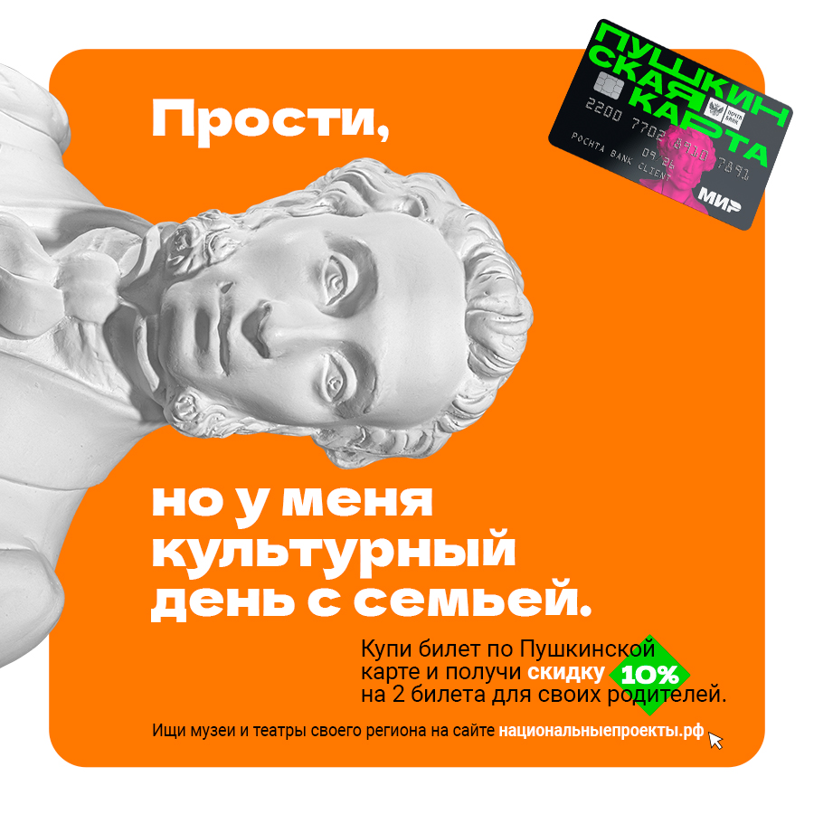 Если вы владелец «Пушкинской карты» и давно не ходили в театр вместе с родителями, то эта акция специально для вас. Прекрасная возможность провести время со своей семьей культурно, интересно и полезно.