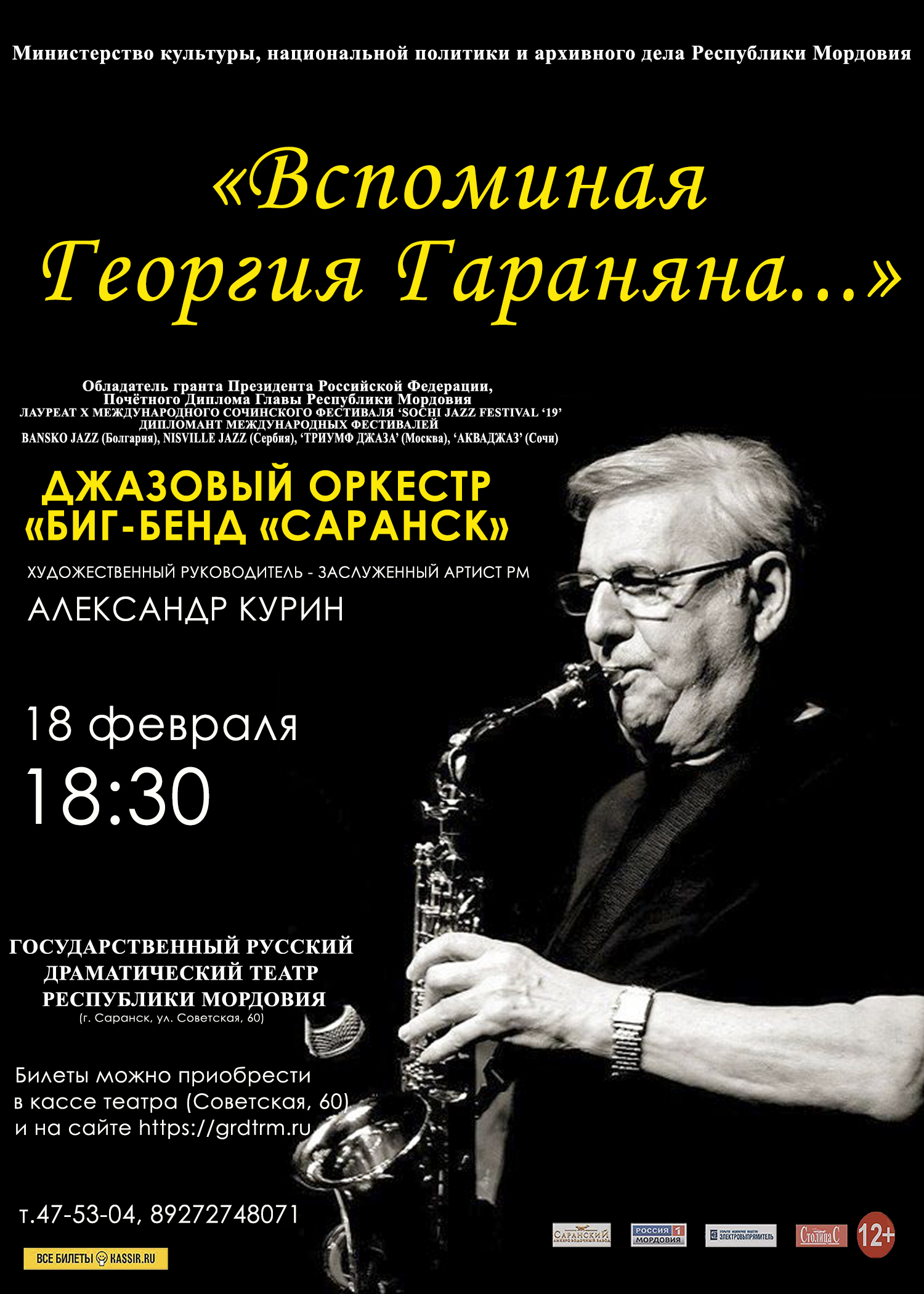 Георгий Арамович - выдающийся советский и российский джазовый саксофонист, композитор и дирижёр, ставший при жизни "легендой советского джаза", "золотым саксофоном России", "сакс-символом".... Много лет Гаранян сотрудничал с саранскими музыкантами, был первым художественным руководителем (вместе с Александром Куриным) Международного фестиваля джазовой музыки "Вейсэ-джаз", привозил замечательные бенды, джазовых "звёзд первой величины" из 28 стран мира и всегда был образцом высочайшей человеческой и музыкальной культуры.